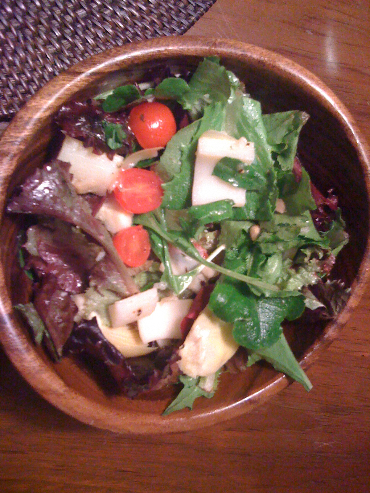 Add garlic, lemon, salt, pepper, and oil together in a wooden bowl and mix well. Then add the tomatoes, artichoke hearts and hearts of palm and mix well. Add the lettuce on top without mixing. Cover the bowl and let sit in the fridge for approximately 1-2 hours. Toss salad and serve!